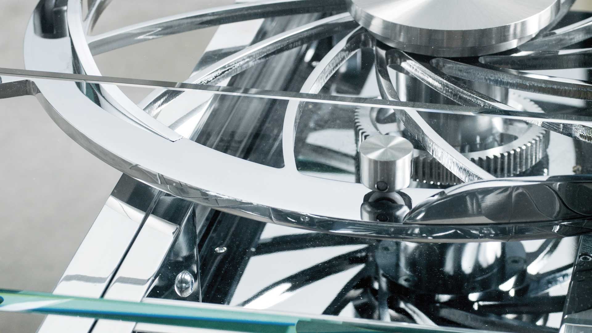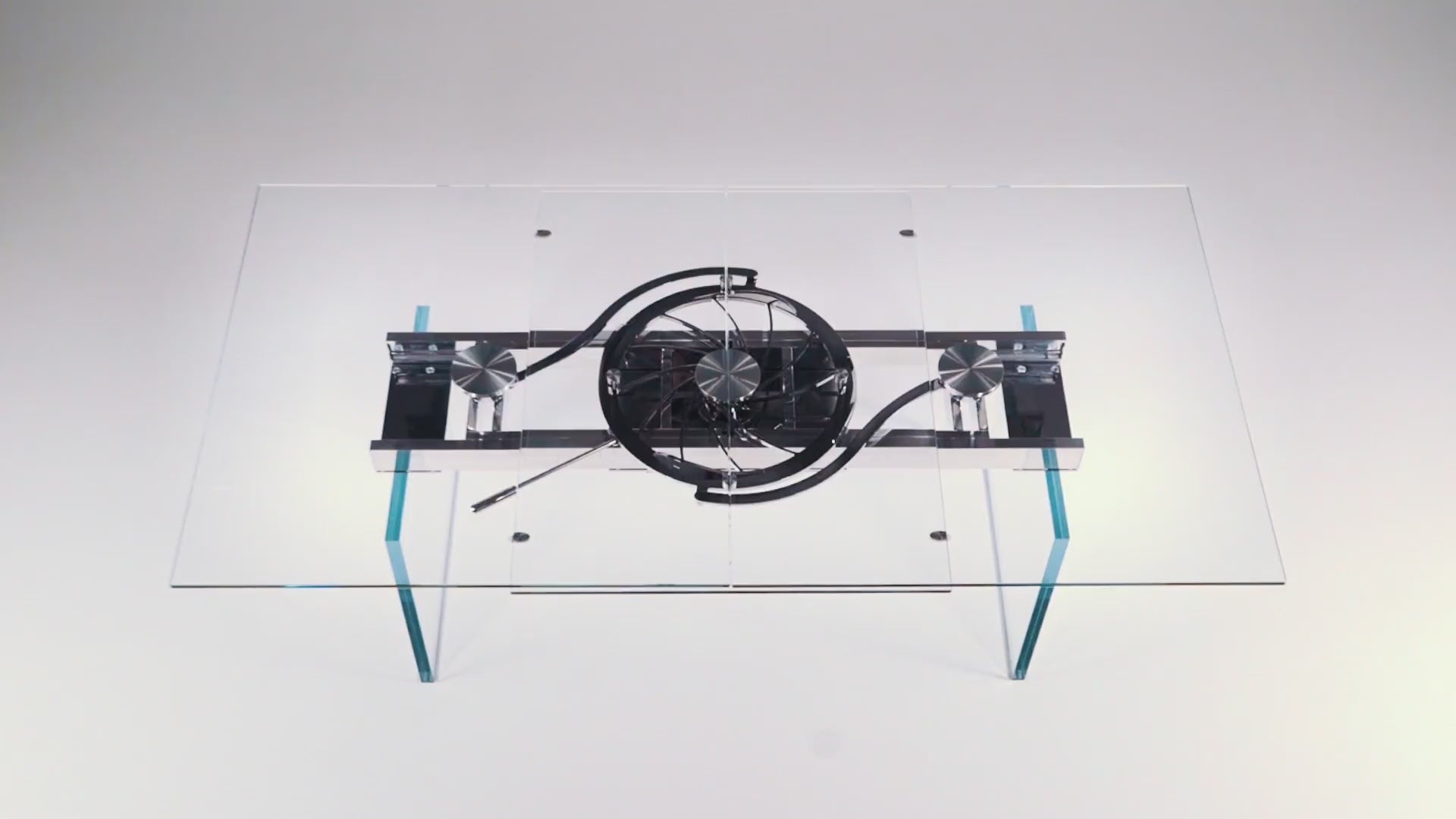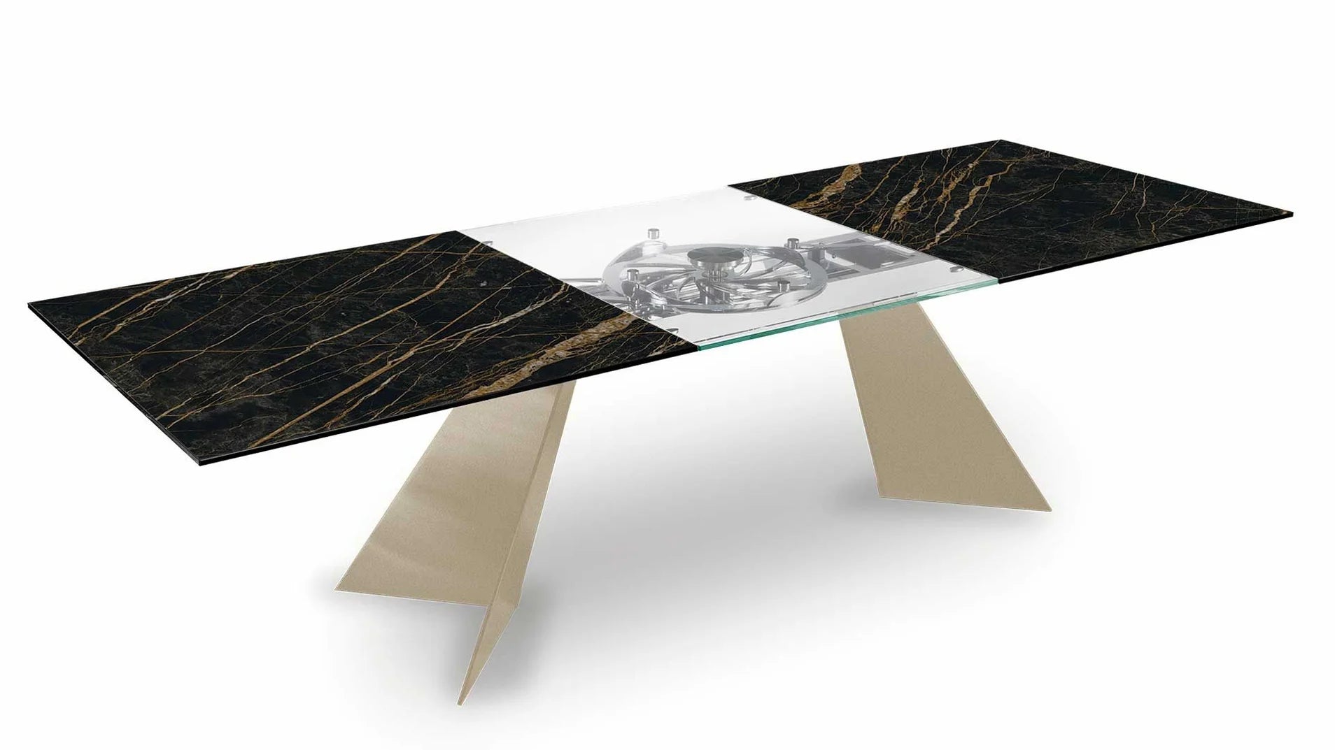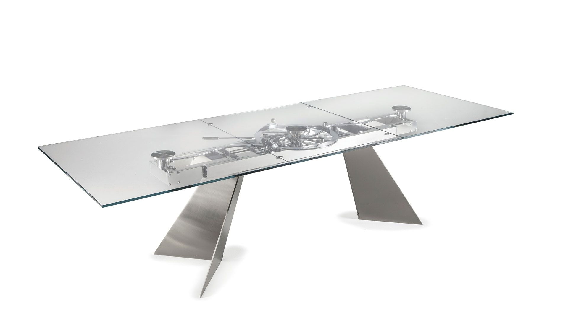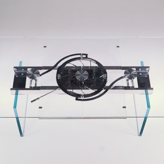 EXTENSIBLE DINING TABLE WITH GLASS OR CERAMIC TOPS. LEGS IN CHROMED OR PAINTED STEEL. EQUIPPED WITH A SYNCHRONIZED MECHANISM FOR LATERAL EXTENSIONS WIDENING AND CENTRAL EXTENSION LIFTING. AVAILABLE WITH OR WITHOUT REMOTE CONTROL.